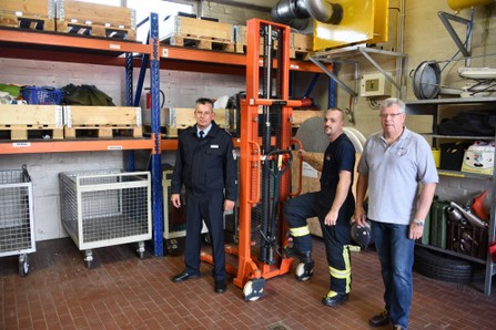 Manchmal kann es ohne Bürokratie ganz schnell gehen wenn alle entscheidenden Stellen zusammenarbeiten, betonten Ortsbrandmeister Sven Grabbe und der 2. Vorsitzende des Fördervereins der Ortsfeuerwehr Sehnde, Andreas Pohl. Nach den ersten Gesprächen hatte es 4 Wochen bis zur Beschlussfassung des Vorstandes des Fördervereins gebraucht und innerhalb von 3 Tagen war der gewünschte Hubwagen da. Die Kosten beliefen sich auf 2.300 Euro, die aus dem laufenden Etat bezahlt wurden. Jetzt kann im Einsatzfall schnell gehandelt werden und die Fahrzeuge können mit den gewünschten Gegenständen aus dem Hochregallager bestückt werden. Ganze 1000 kg Tragkraft hat der Hubwagen und kann die geforderte Höhe von 2,50 m gut erreichen. Dazu gab es vom Förderverein noch den gewünschten Halter für die Wärmebildkamera. Es ist von großem Vorteil, wenn dieses Werkzeug am Mann geführt werden kann und man beim Erklettern von Leitern oder ähnlichen Hindernissen beide Hände frei hat. Für das Jahr 2018 gibt es noch Überlegungen, was der Förderverein zur Ausstattung der Ortsfeuerwehr beitragen kann. Auf jeden Fall freuen sich alle, dass die Mitglieder des Fördervereins ihren Beitrag zur Einsatzfähigkeit unserer Feuerwehr leisten.