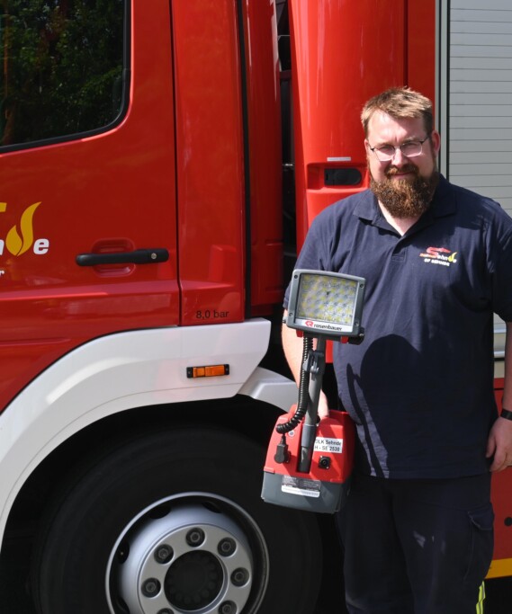 AkkuleuchteBei dem Akku Schweinwerfer handelt es sich um eine nicht standortgebundene Leuchte, die auch von einem Feuerwehrmitglied allein in Stellung gebracht werden kann. So muss man kein Stativ oder Kabel verlegen, um sie schnell einsatzbereit zu bekommen. Durch die LED-Technik macht die Leuchte einen extrem hellen Lichtkegel, welcher das Arbeiten im Dunkeln erleichtert.